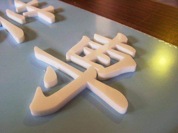 5mm厚で、文字自体の大きさは30mm角ぐらいなので、