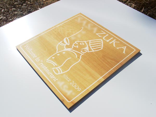 レストランの木製看板になる予定です。因みに同じ図柄が裏面にも彫刻をしています。